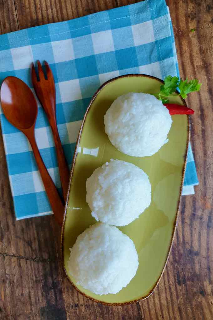 Omo tuo is a Ghanaian side dish originating from the Hausa people, made by cooking very soft rice, then pounding or rolling the rice into sticky balls.