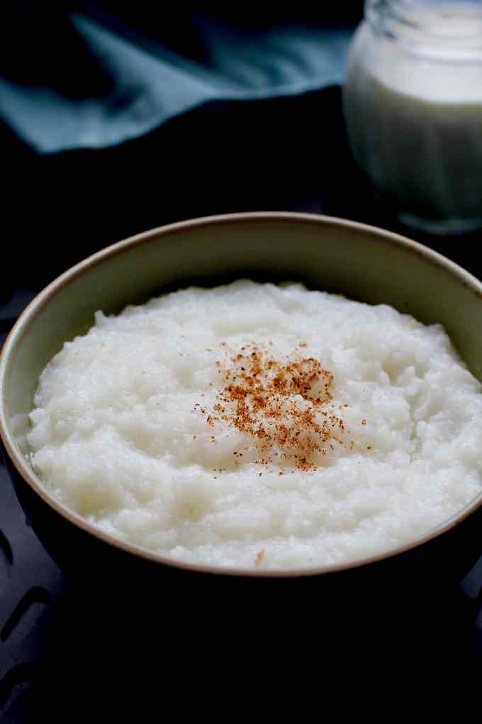 - Serve the hot rice water with a pinch of nutmeg, evaporated milk, sugar (or honey), toasted nuts and coconut flakes or other ingredients of your choice.